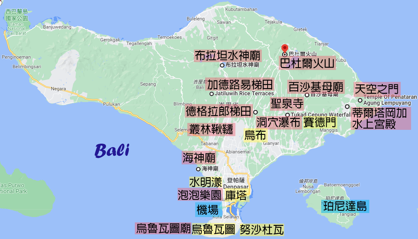 峇里島其實比想像中的要大上許多,住宿也分成很多不同的區域,上面的地圖大概標出了峇里島比較熱門的景點,以及六個不同區域的大概地理位置。