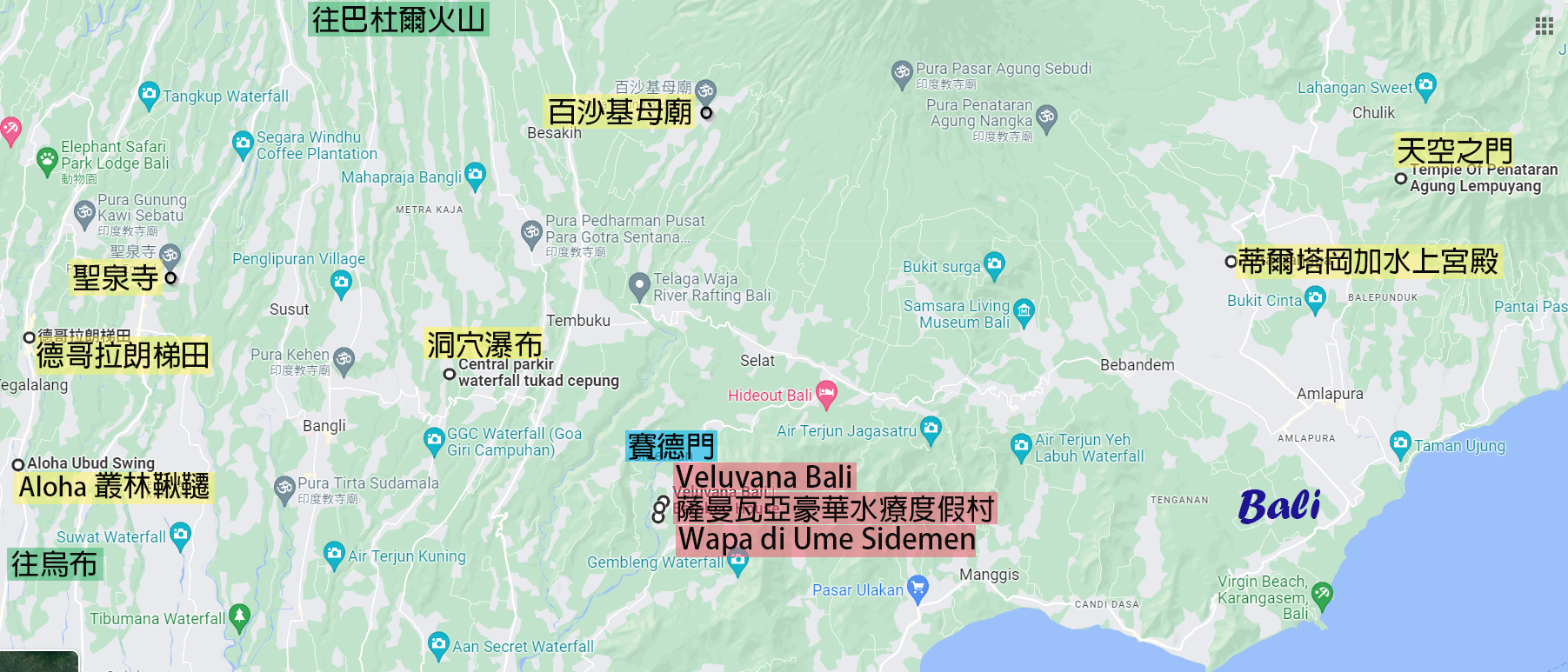 原本沒有打算介紹這一區的住宿,但後來發現賽德門區有不少超誇張的獨特住宿,不但建築特別還可以遠挑山景!根本住宿本身就是必去景點,很適合喜歡度假在飯店放鬆以及喜歡自然景觀的人!這麼讚的地方不能只有我知道,這邊就分享幾間超浮誇的住宿資訊吧!賽德門位置在烏布和天空之門的中間,距離烏布及天空之門各約1小時左右的車程,距離洞穴瀑布約40分車程。
