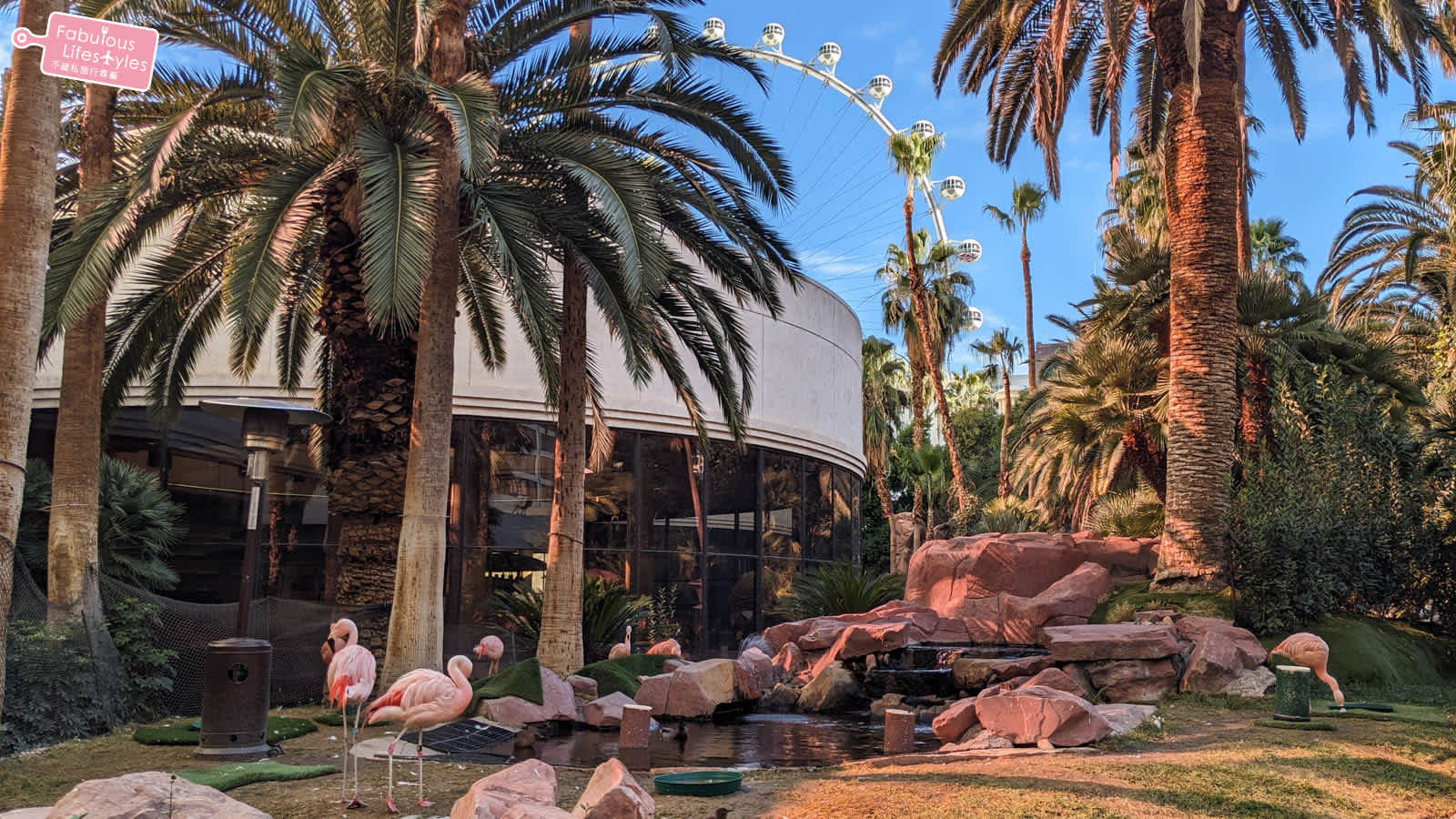 粉嫩的紅鶴、蔥翠的樹木、壯觀的摩天輪再加上後方湛藍的天空,形成一幅屬於拉斯維加斯的特別景象~