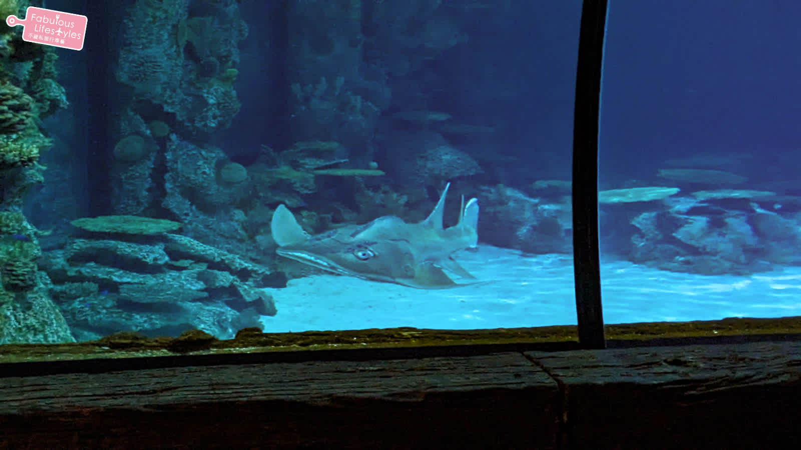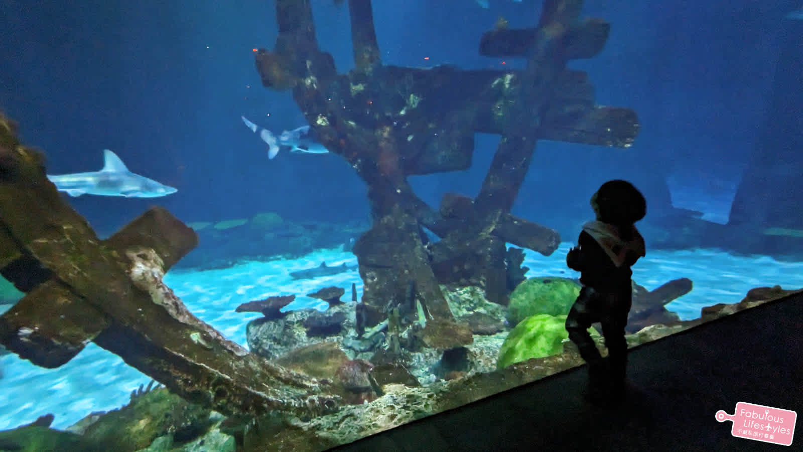 這個展區有幾隻長得非常特別的鯊魚,氣氛也做的得非常到位,超大透著深藍色的水族箱,很多鯊魚在沉船的殘骸中來回穿梭,寧靜又帶著濃厚的神祕感~