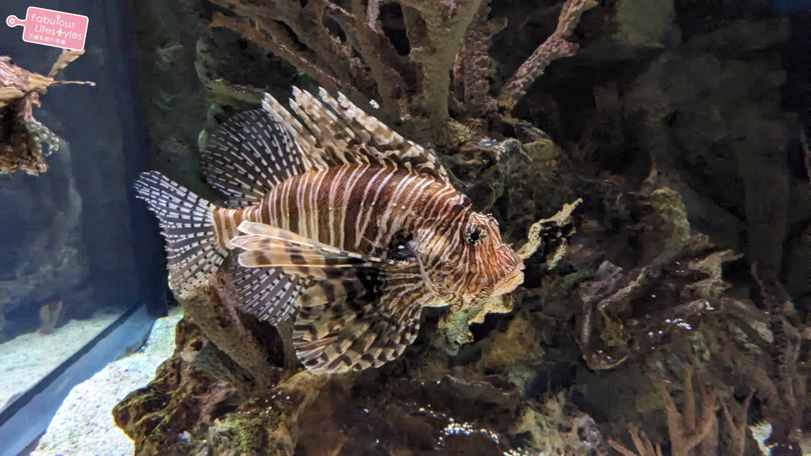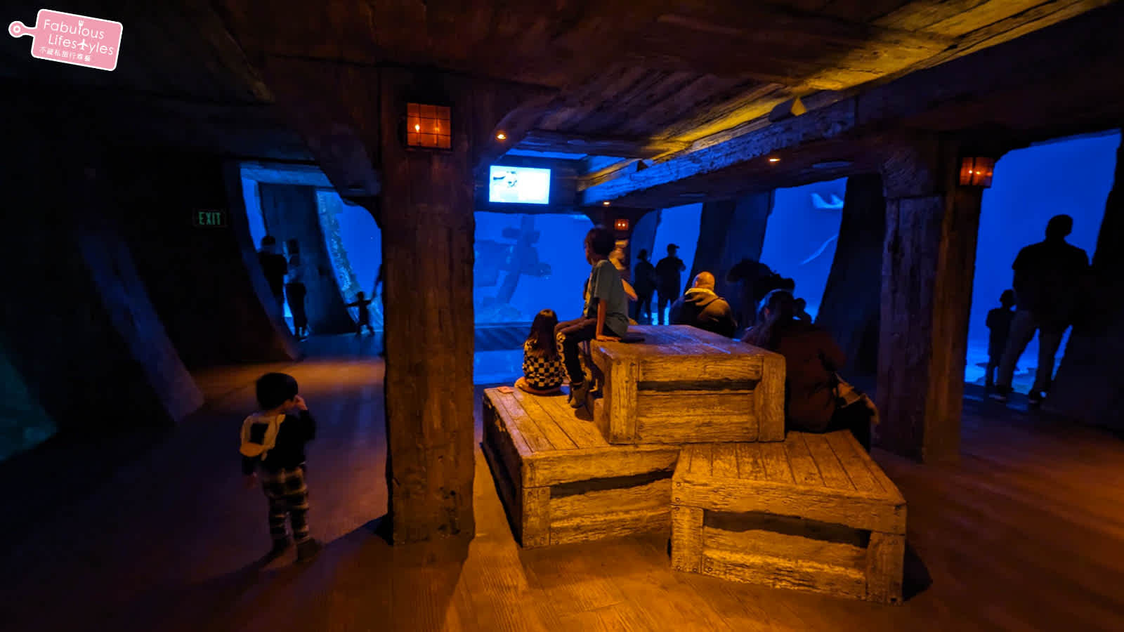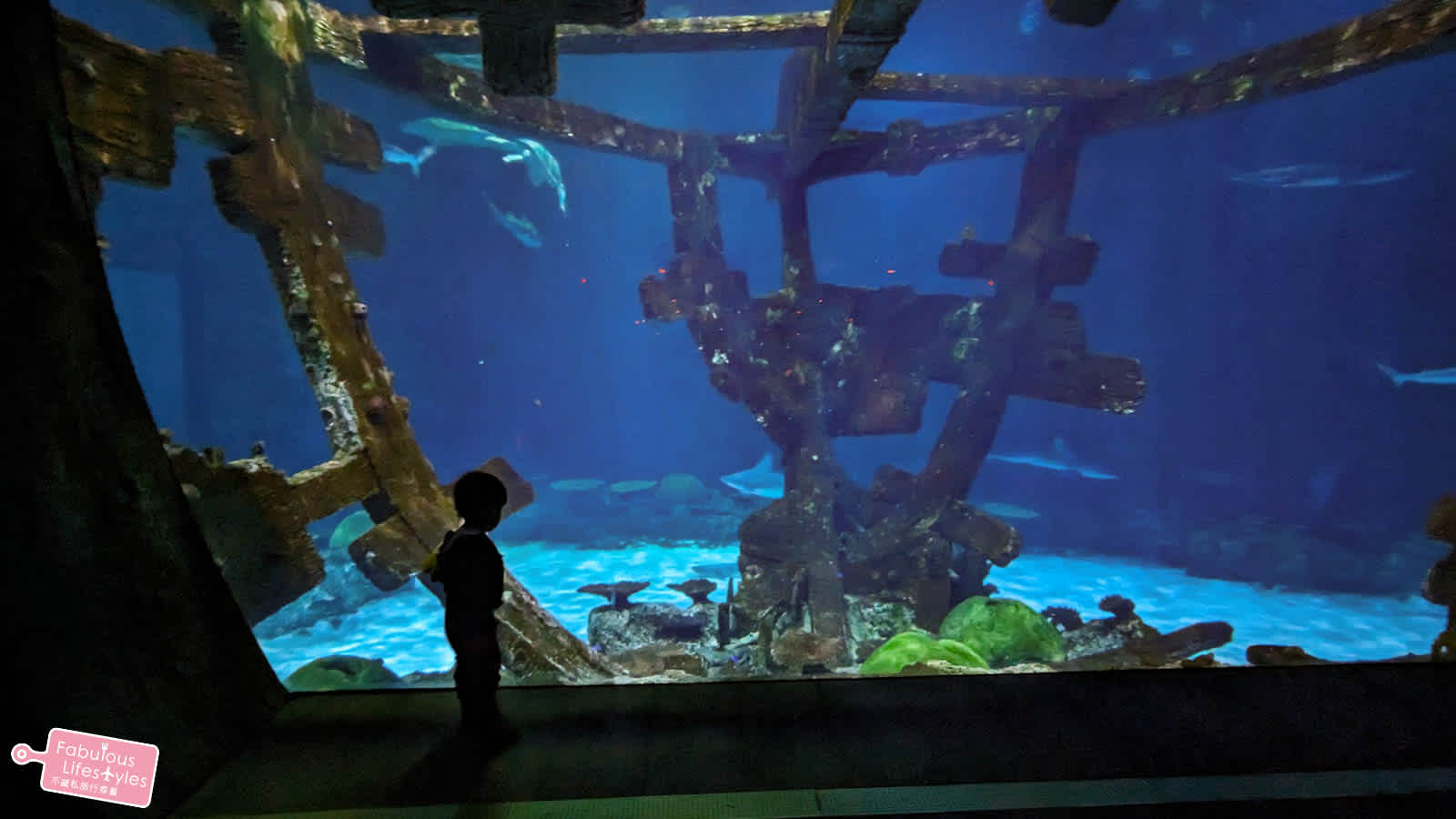 而眼前超大的展區原來是一個沈船的殘骸,我們彷彿坐在沉入海底的沉船艙內,觀賞這些生活在沉船殘骸中的魚群們~