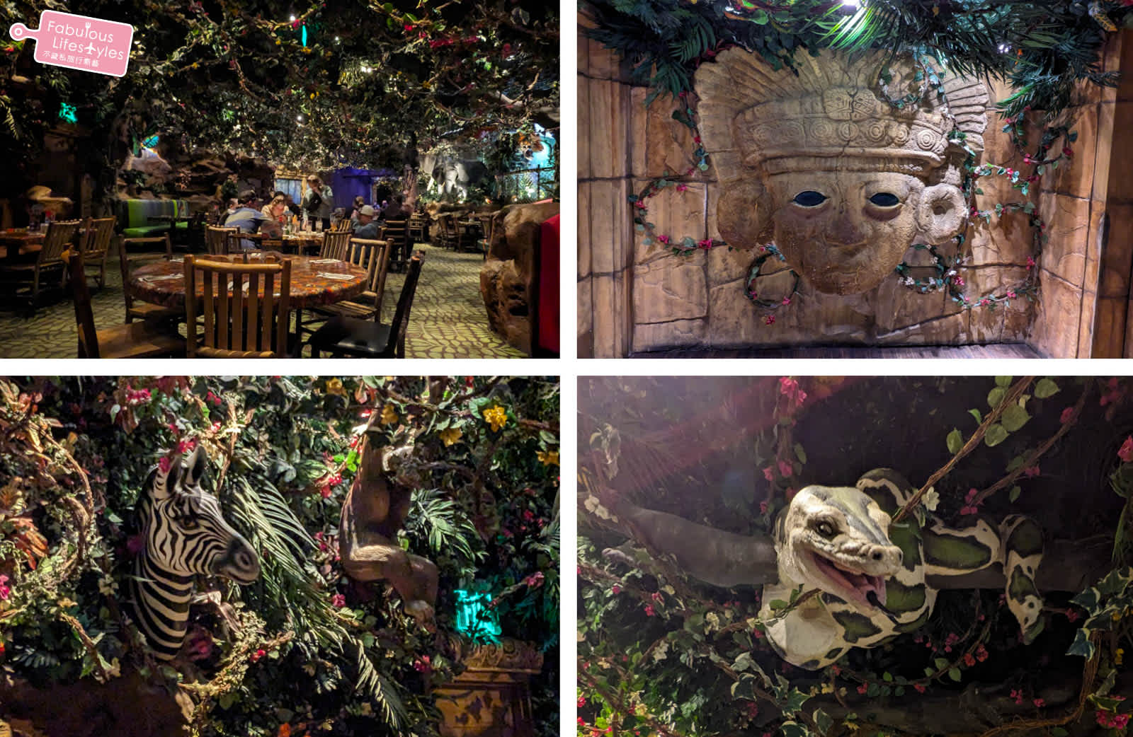 這是一間以熱帶雨林為主題的餐廳,裡面有各種動物藏身在餐廳各處,不但布置得很像,周圍也是雨林的環境音繚繞,坐在餐廳用餐彷彿置身熱帶雨林真的很棒。到訪之前爬了一些網路評論,對於熱帶雨林主題餐廳的餐點褒貶很兩極。櫻桃個人是覺得食物表現普通,不難吃也沒有很令人驚艷。這種主題餐廳還是勝在氣氛,不過值得一提的是如果小朋友很怕打雷的那種,其實櫻桃就不是很建議前往。因為餐廳內的雨林音效每隔十幾二十分鐘會有超逼真打雷下雨的音效,我鵝子很怕~ 所以每到打雷就非要我抱 😅。如果小朋友年紀較大也沒在怕打雷,是蠻推薦有順路的話可以體驗看看這家餐廳