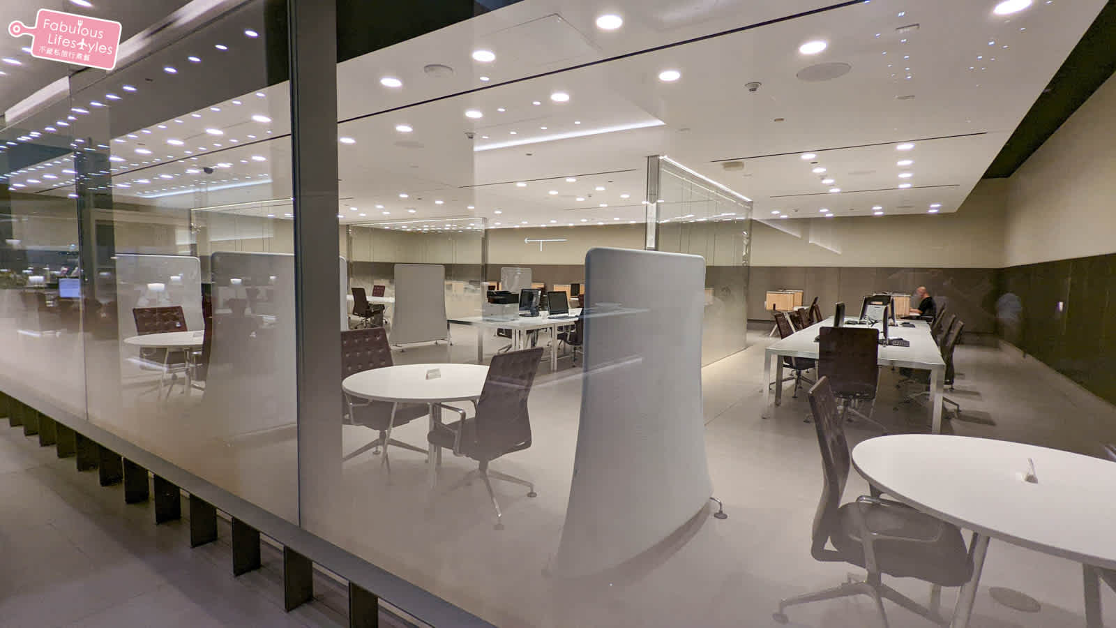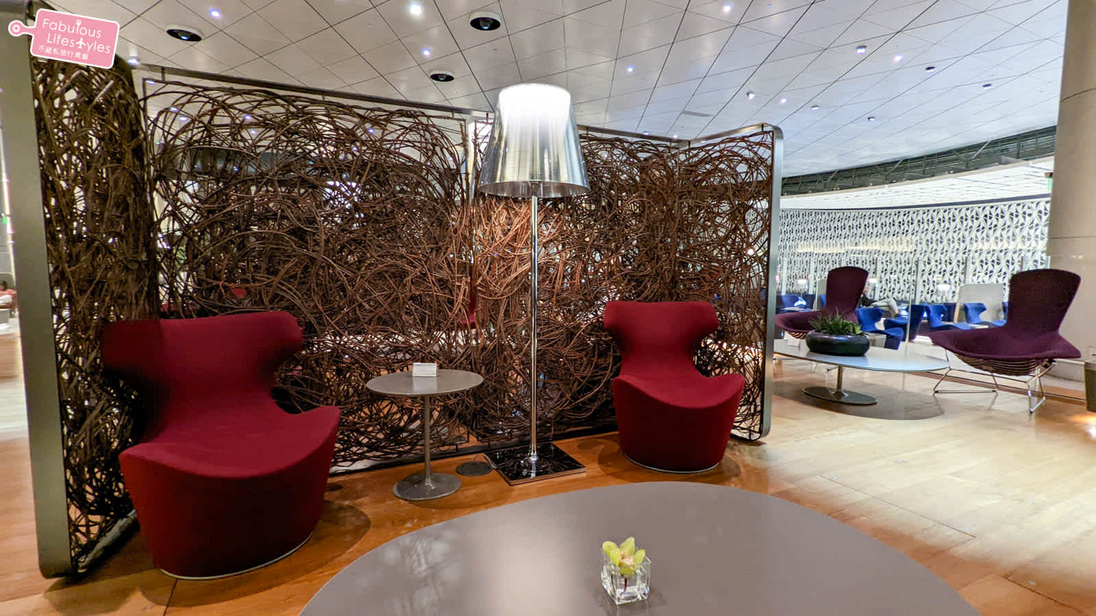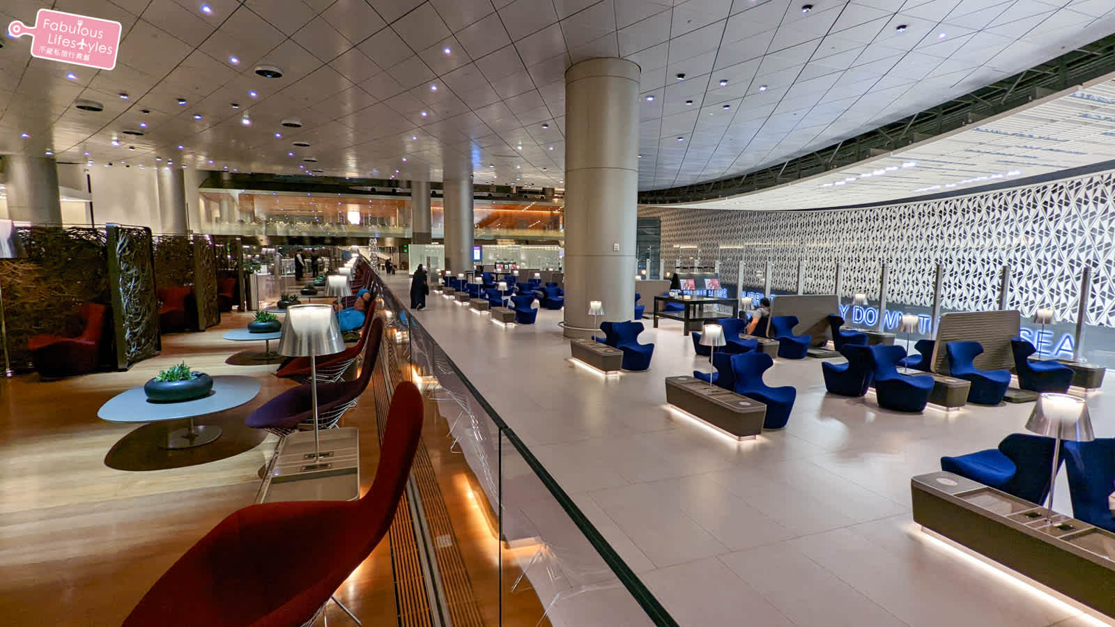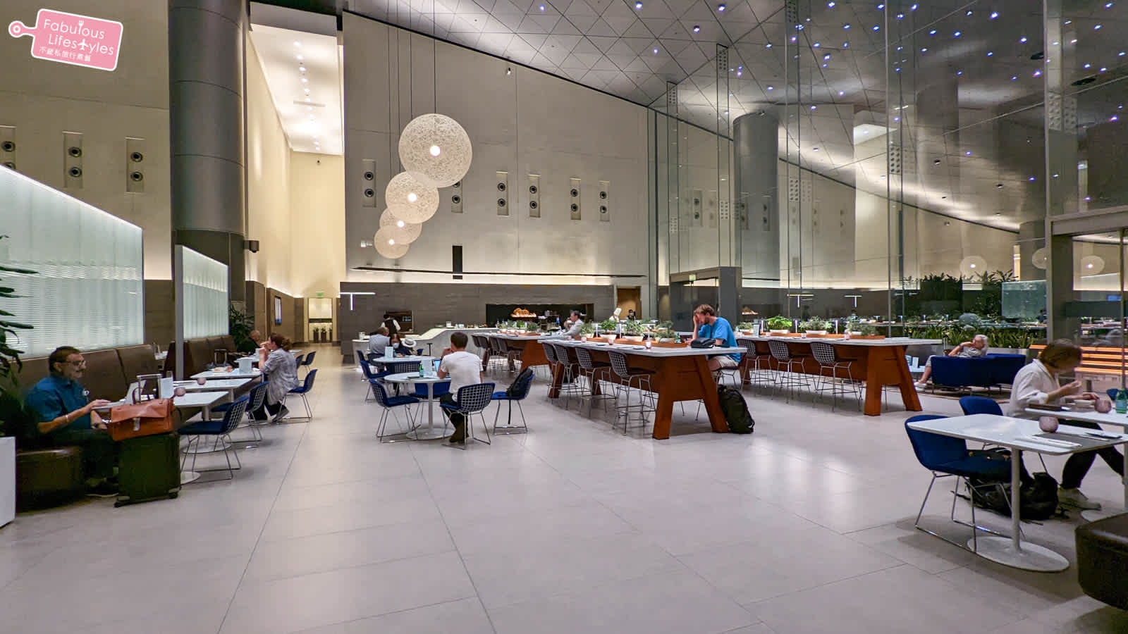 總面積高達100,000平方英尺 (約2,800坪) 的貴賓室,能同時容納1,000名旅客,超大的貴賓室規劃了許多不同性質的座位區和休息區讓所有不同需求的旅客可以自由選擇~其中水池旁邊的休息區,就位在超挑高的大面落地窗戶旁,可以看的到戶外停靠的飛機~