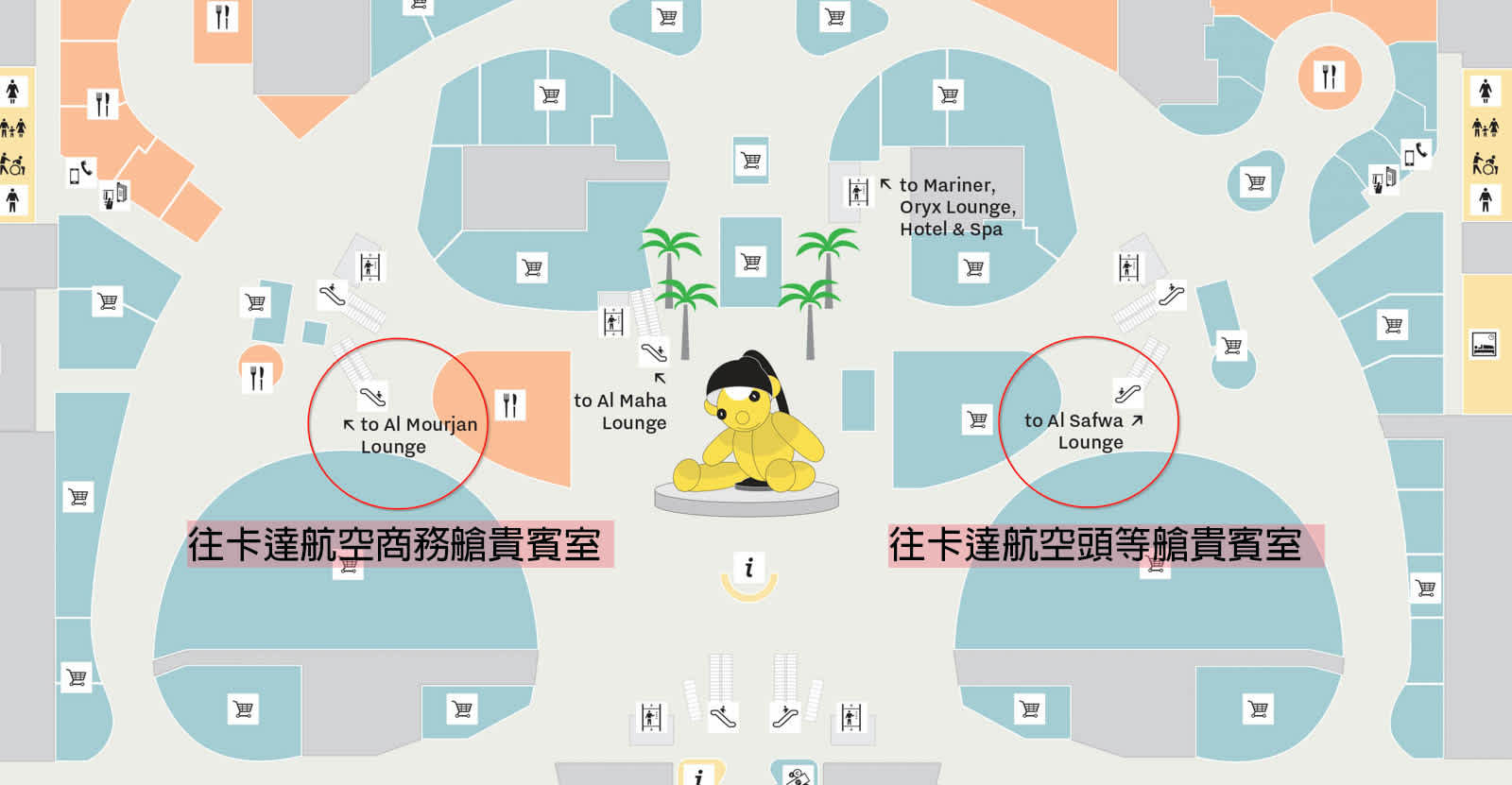 要去「卡達航空商務艙貴賓室 Al Mourjan business lounge」的話,面對泰迪熊的話是往左邊的手扶梯走,而頭等艙貴賓室 Al Safwa First Lounge 則是往右邊的手扶梯走
