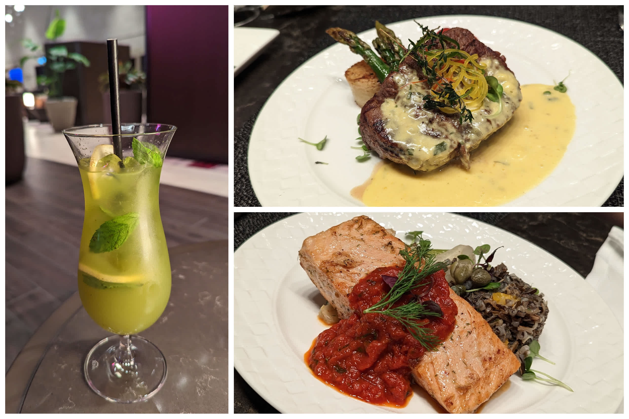 餐廳內可以直接點餐,有機會別忘了喝喝看卡達航空的 signature drink 👉🏻 Lemon mint ,酸酸甜甜帶上薄荷的香氣,真的好喝!食物的口味方面,繼上次在卡達航空 Al Mourjan business lounge 貴賓室的體驗後,原本是不抱太大期望😅,但沒想到這次點的鮭魚還蠻好吃的~口感鮮嫩味道也不錯~