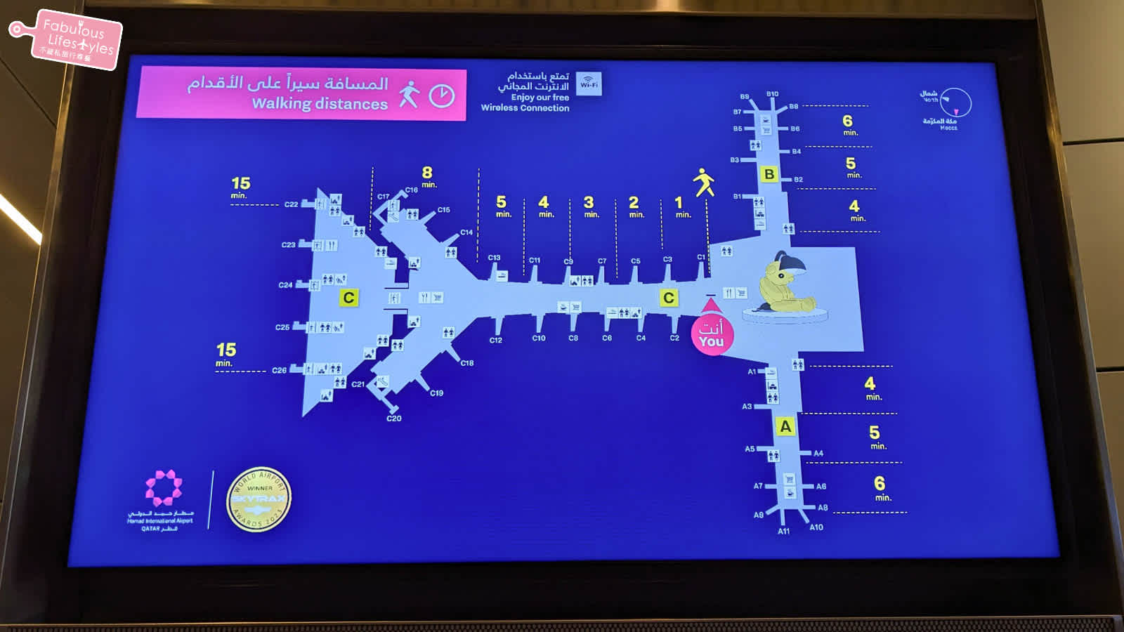 這隻高7米重達18-20噸的泰迪熊除了必打卡之外,更是位於哈馬德國際機場交界的位置,泰迪熊的右左以及後方分別為 A B C 三個不同的區域,上圖還有標示大概的步行所需時間~