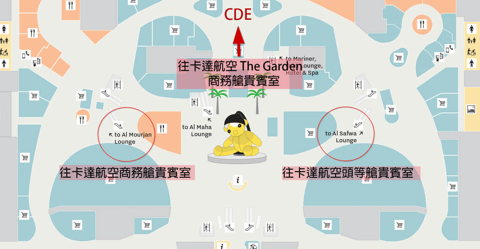 要去「卡達航空商務艙貴賓室 Al Mourjan business lounge」的話,面對泰迪熊的話是往左邊的手扶梯走,而頭等艙貴賓室 Al Safwa First Lounge 則是往右邊的手扶梯走。而這篇要介紹的 The Garden 則是在泰迪熊的後方,往CDE號登機門的標示走。如果不想走也可至二樓搭乘電車在C號登機門下車