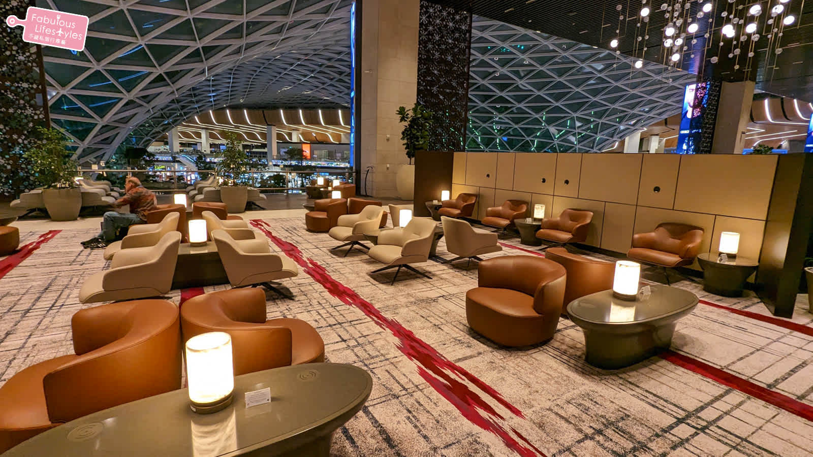 諾大的座位區寬敞挑高,一側可以看見旁邊綠意盎然的熱帶花園 The Orchard,不像 Al Mourjan business lounge 商務艙貴賓室 有亮眼的寶藍色及紅色, 這間貴賓室的座椅顏色都以大地色系為主,相信應該也是為了呼應花園這個主題!