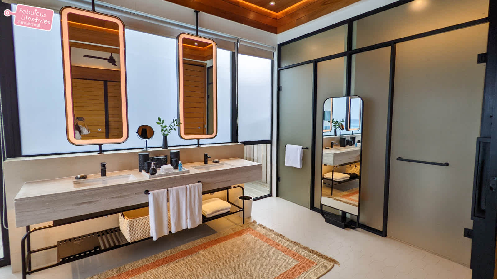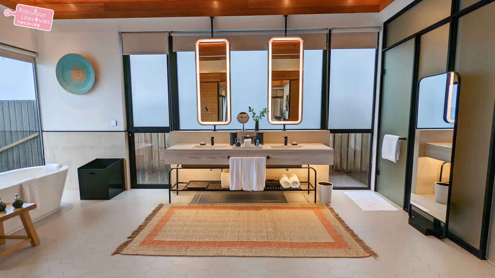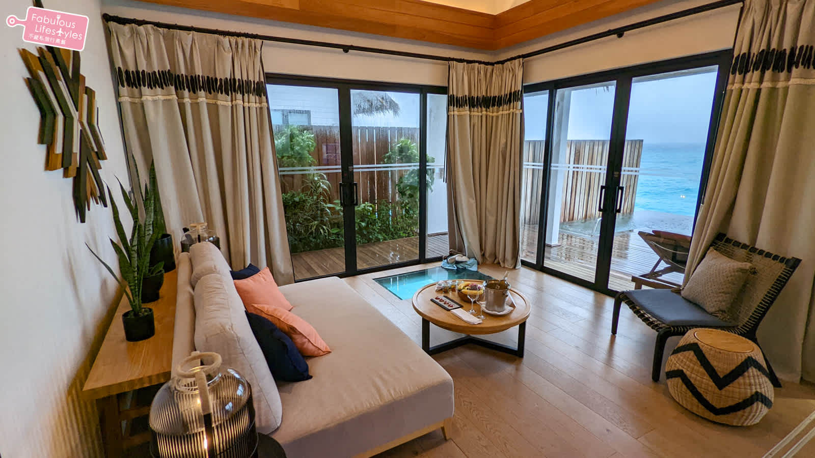 整體空間高達約55坪(181平方公尺)的套房水上Villa室內十足開放式的空間設計,雖然空間很大,但幾乎可以一眼看完全景,獨立的小客廳、客房、衛浴~三面採光的設計,最重要的是不管在哪個空間只要一轉頭就可以看到馬爾地夫蔚藍的海景