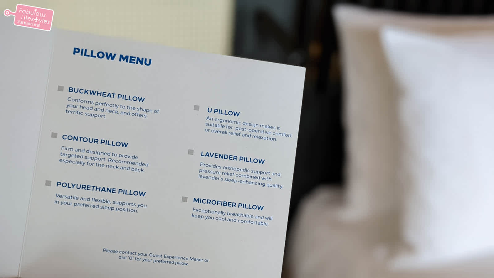 不過如果你覺得枕頭躺起來不適合的話,床頭桌上還放了一張枕頭的Menu,有多種可以挑選~好像是第一次入住到提供詳細枕頭Menu的飯店,覺得很新奇~