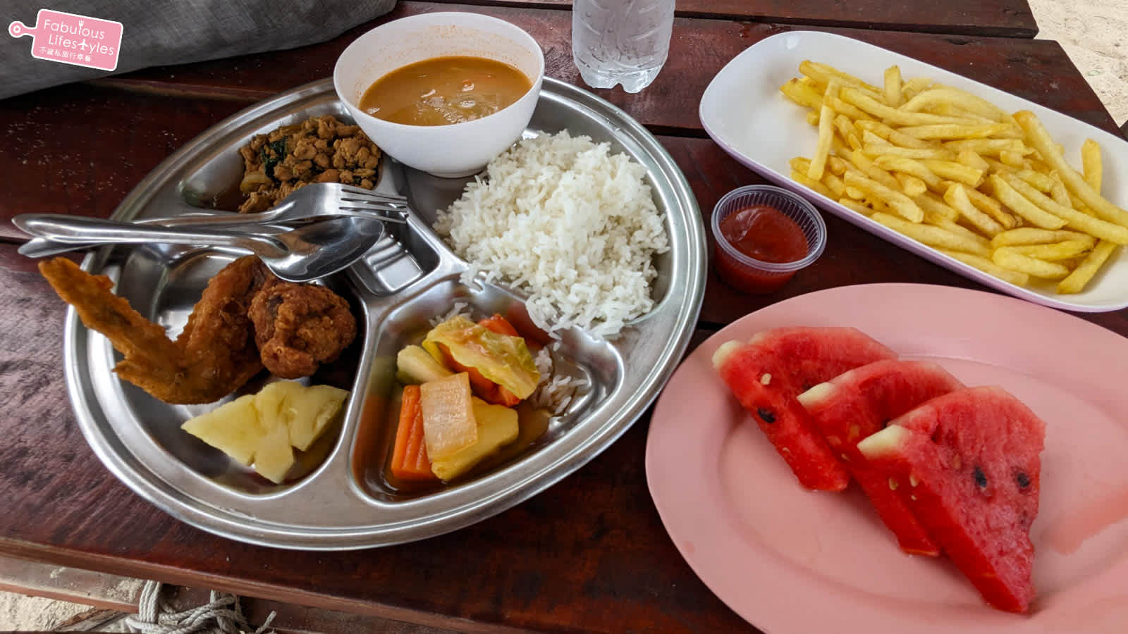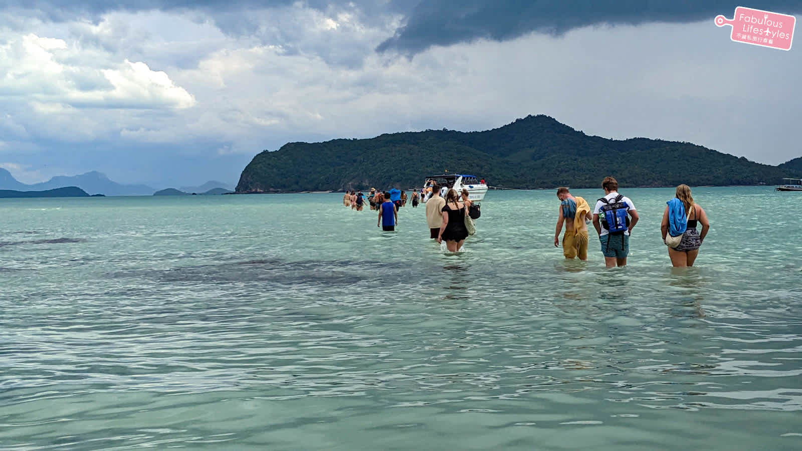 下船時值得一提的是,船停在離沙灘比較遠的地方,因此我們得從水及大腿的海中下船,打赤腳往返豬島。這邊推薦大家如果要參加豬島的行程,可以穿著水鞋,因為其實沙灘蠻刺腳的,有零星珊瑚石頭等,赤腳走要小心注意腳下