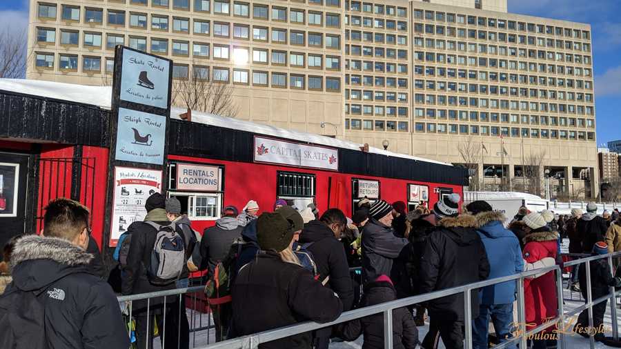 渥太華的麗都運河每年 2 月初左右都會開放特定區段供民眾在結冰的運河上溜冰,從城堡飯店旁的運河出發一直到 7.8 公里外的終點站-道斯湖(Dow’s Lake),是全世界最大的溜冰場喔! 畢竟是室外的溜冰場,官方會依照當天的天氣和運河冰的狀況開放不同的區域。我們前幾天去的時候城堡飯店這區因為狀況不佳沒有開放(照片是 2019 年照的)。