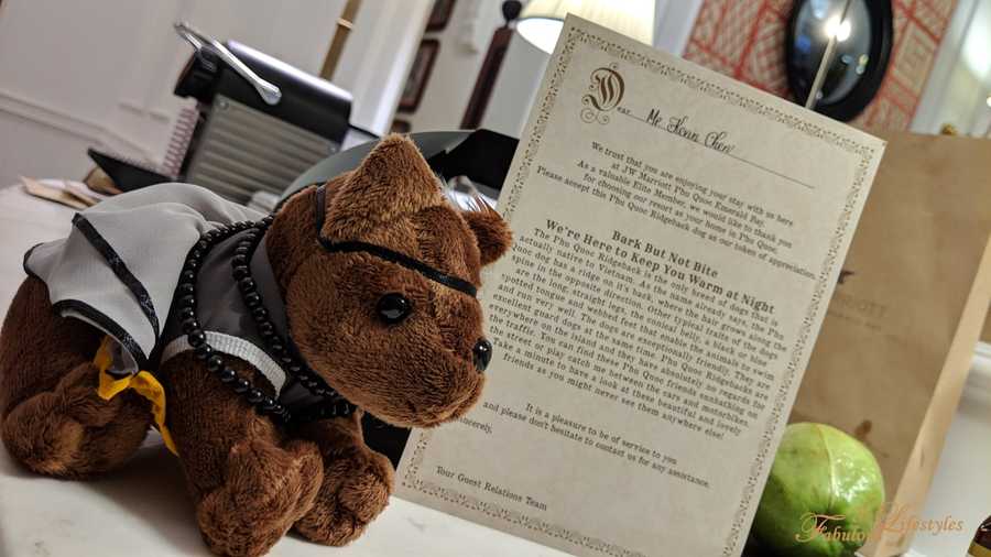 離開前的最後一晚還收到度假村送的狗狗,她穿的是跟 Welcome Team 一樣的制服喔!