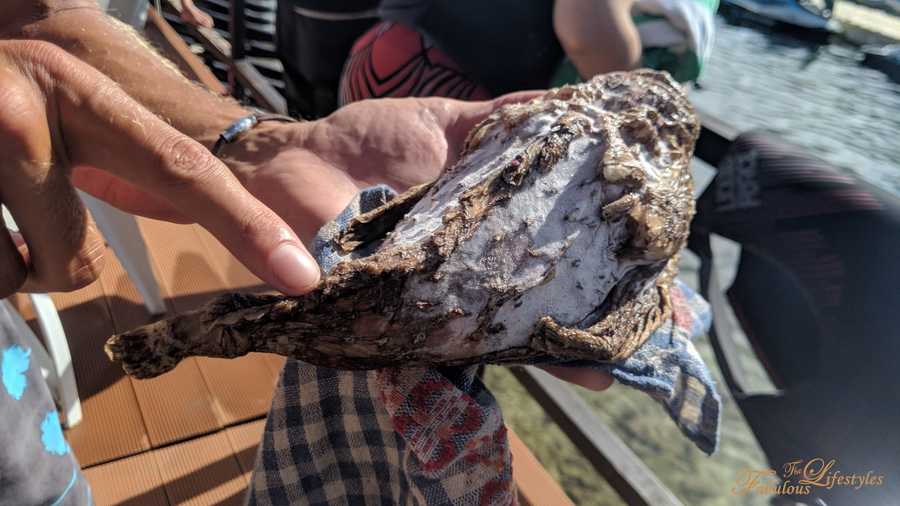 水鞋大概是櫻桃最最最最~推薦一定要帶的東西,大溪地的淺灘有有毒的魚 stone fish,如果不小心摸到或踩到輕則住院重則致命(尤其小朋友)!所以不論是在飯店或是在其他公共海灘都不建議光腳。有雙包覆性好的水鞋假不論是在飯店內浮淺或做水上活動都很方便,水鞋在海裡行動方便也比較安全喔!下圖為茉莉亞島水上摩托車的響導在提醒我們 stonefish 的危險性時拿出的一個標本。